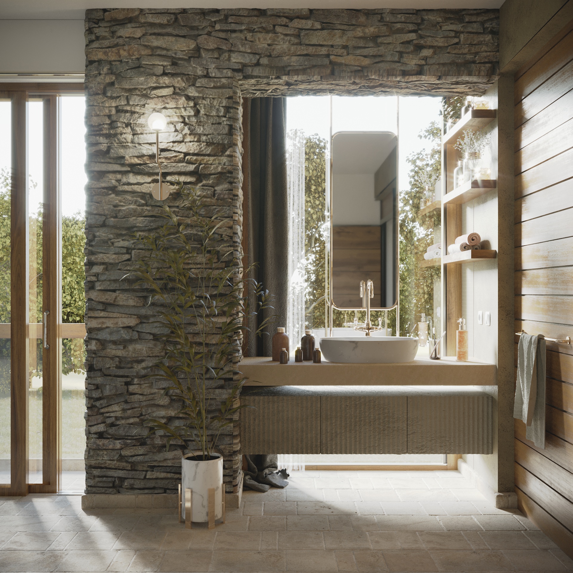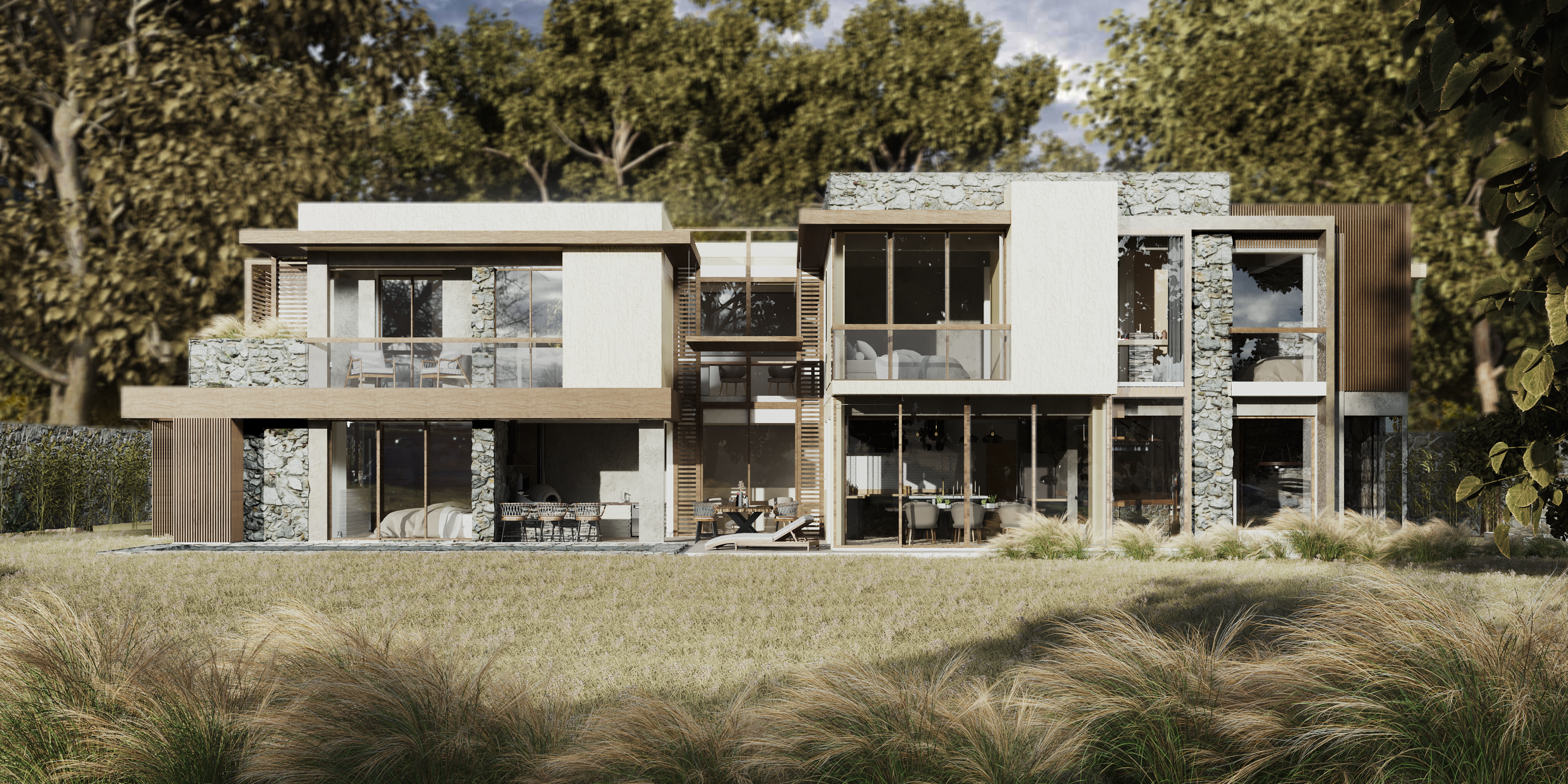 En las fachadas se buscó enmarcar los diferentes volúmenes de la vivienda mediante el uso de distintas materialidades para contrastarlas entre sí, buscando un equilibrio entre el acabado liso del concreto pigmentado de un tono ocre claro; la textura rústica del acabado de piedra; y la calidez transmitida mediante los tratamientos de la madera. Con respecto al interior, se realizó un diseño rústico y a la vez moderno para cada uno de los espacios.