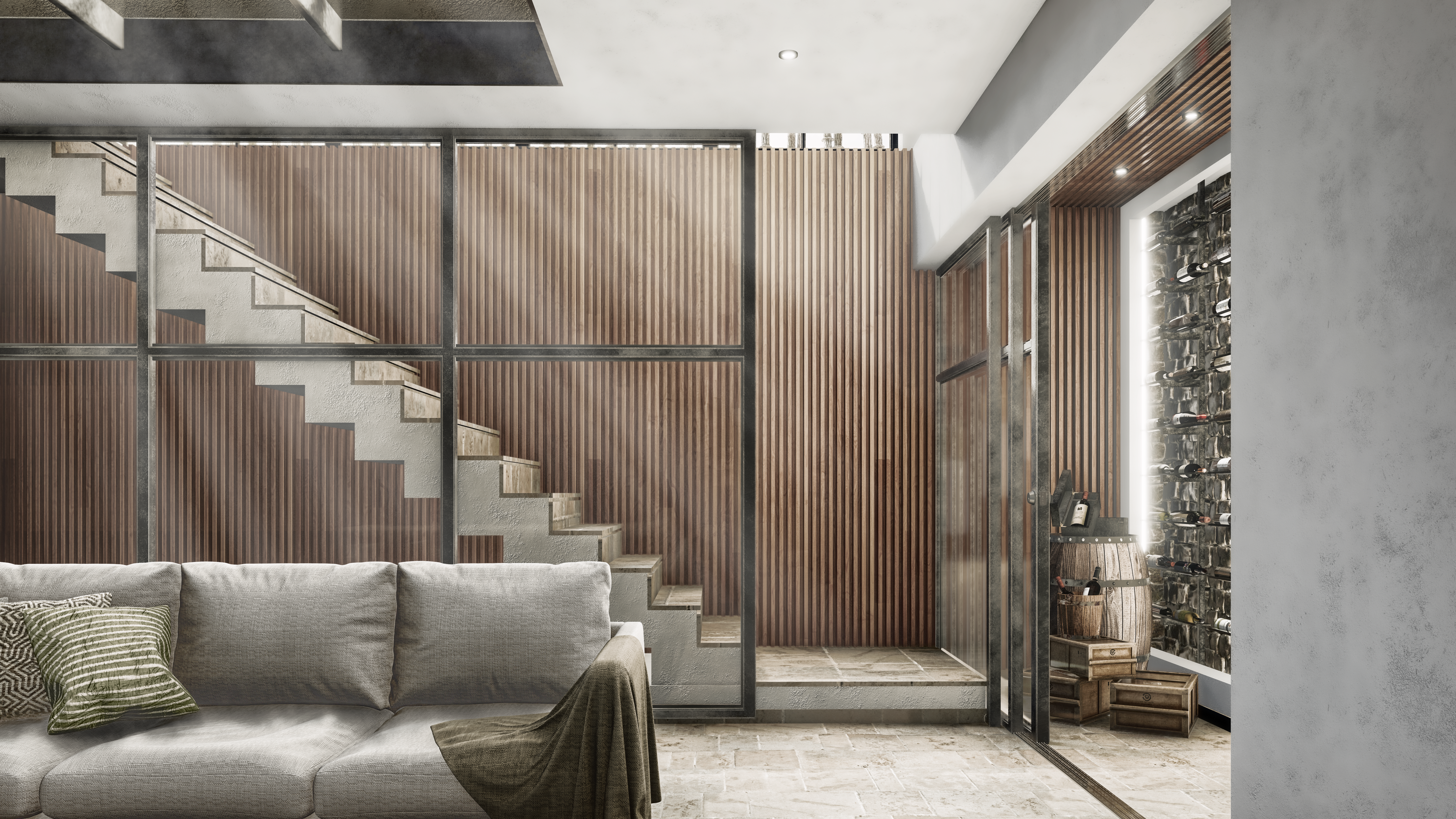 Al llegar al sótano, el espectador se encuentra con una segunda sala iluminada por la luz difusa que ingresa por las escaleras y los paneles de vidrio pavonado ubicados en el piso de la primera planta. Esta sala cuenta con una cava de vinos climatizada, y tiene acceso hacia los 2 dormitorios principales y 2 dormitorios de visita, además de la salida hacia el patio-piscina; zona de parrillas y gimnasio.