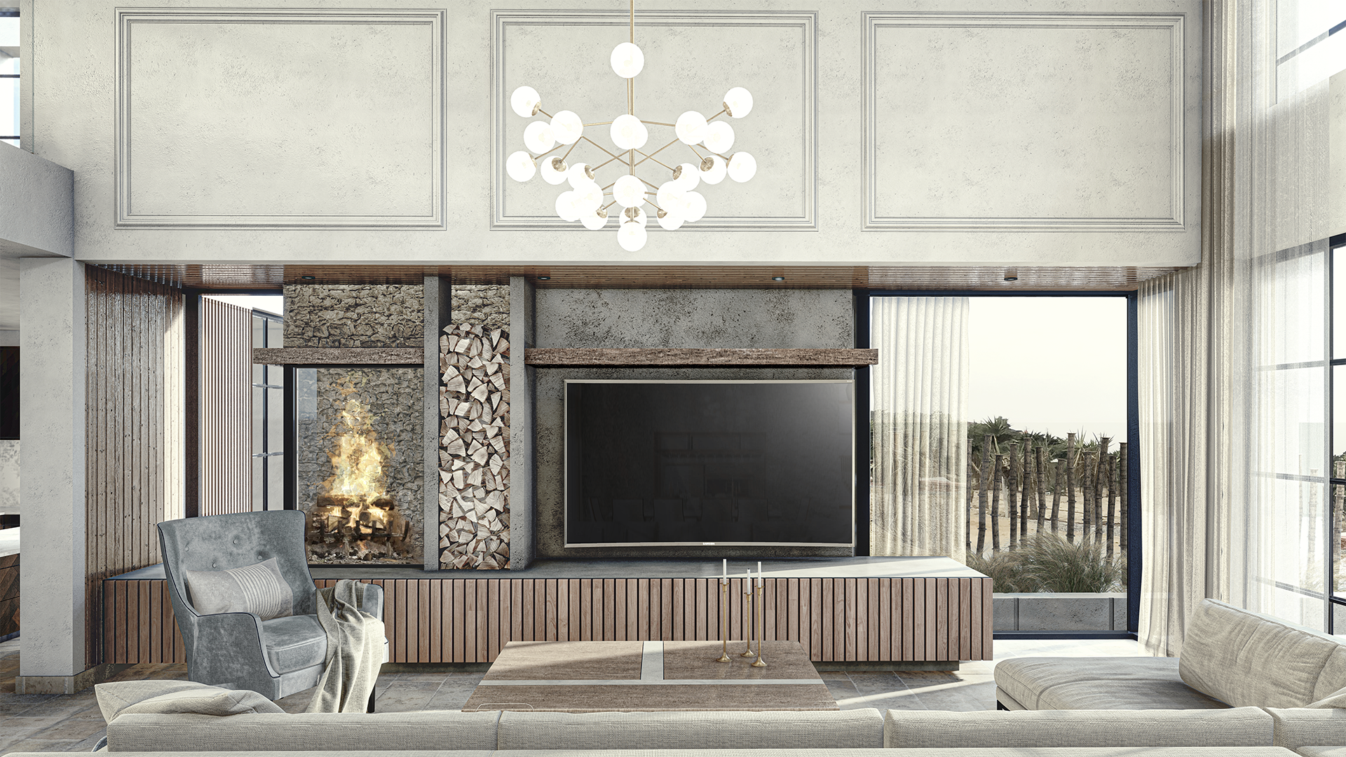 En el nivel superior se encuentra una sala-estudio con relación conexa a la doble altura, bordeado de un balcón perimetral que amplía la percepción del espacio, y te conduce hacia el mirador del proyecto.